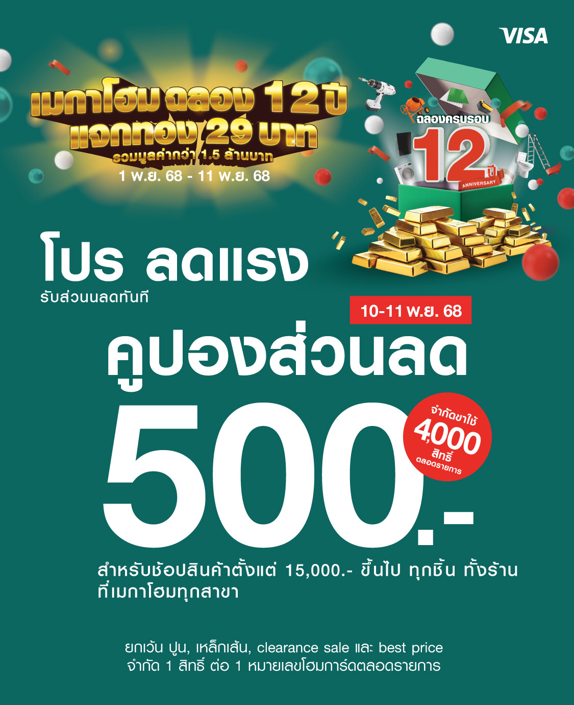 คูปอง 500 บาท ขั้นต่ำ 15,000 บาท ที่เมกาโฮมทุกสาขา และ เมกาโฮมออนไลน์ (10 - 11 Nov 2025)